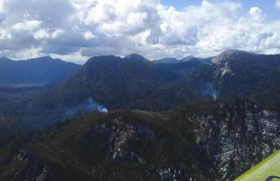 Según se puede advertir en imágenes tomadas desde el aire, se trataría de dos focos distintos, ubicados en las cercanías de la Laguna Verde. En el sector hay presencia de araucarias muertas, que son eventualmente combustible fácil para la expansión de las llamas.