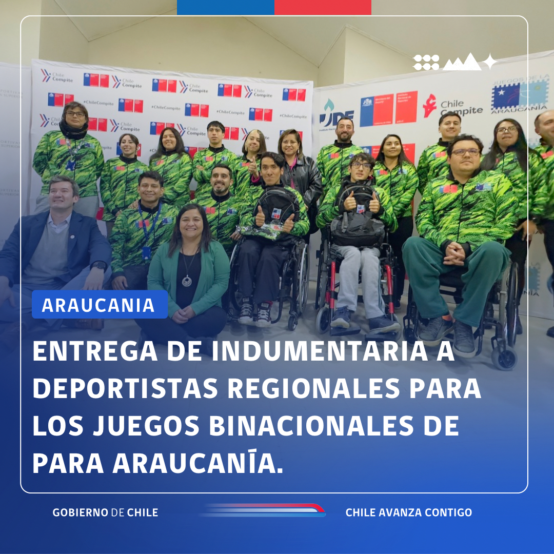 En una emotiva ceremonia realizada el día viernes 03 de mayo, la Dirección Regional del Instituto Nacional del Deporte (IND) de la Araucanía hizo entrega oficial de la indumentaria deportiva a los atletas regionales que nos representarán en la tercera versión de los Juegos Para-Araucanía.