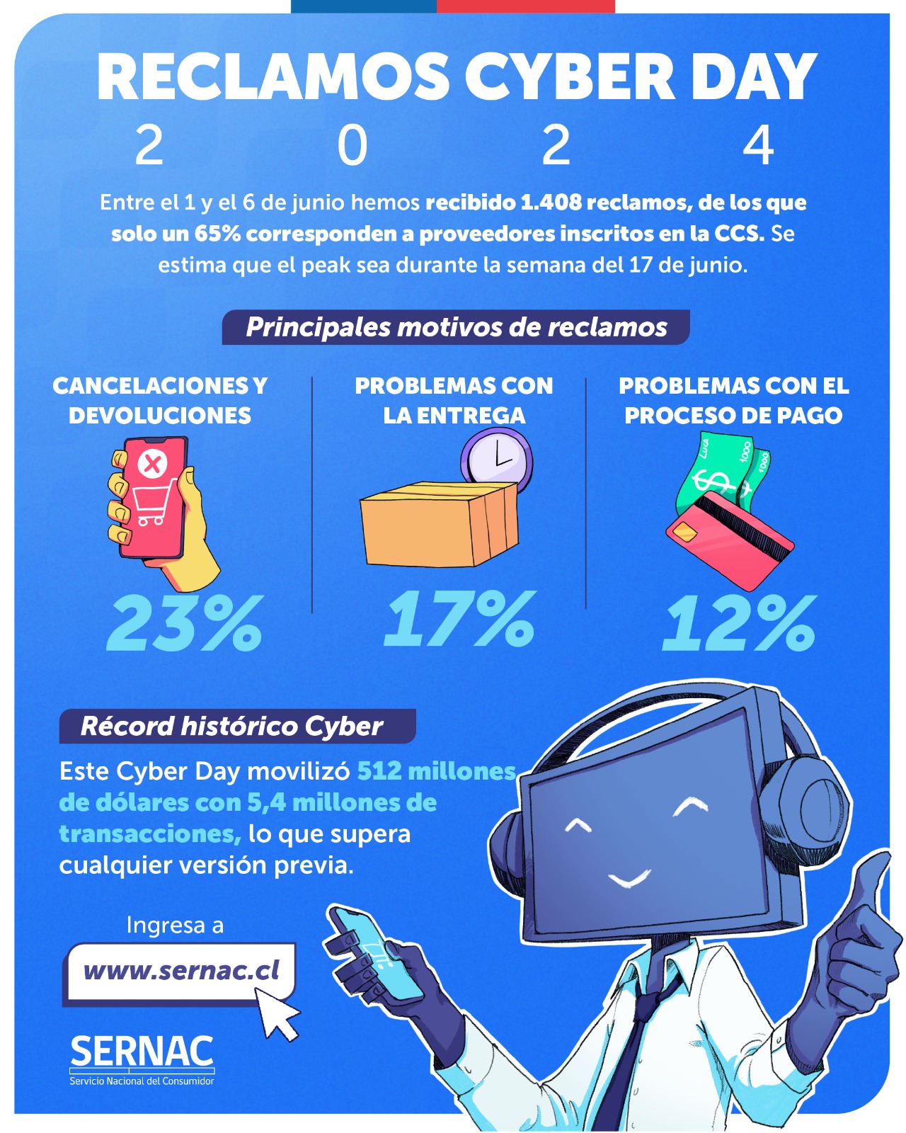 Luego de la realización del Cyber Day, hasta el 6 de junio SERNAC recibió un total de 1.408 reclamos de parte de las personas consumidoras. Del total, un 65% correspondió a empresas inscritas en la Cámara de Comercio de Santiago, organizadora del evento y el otro restante, a empresas que aprovecharon la marca “Cyber Day” para realizar cyber ofertas.