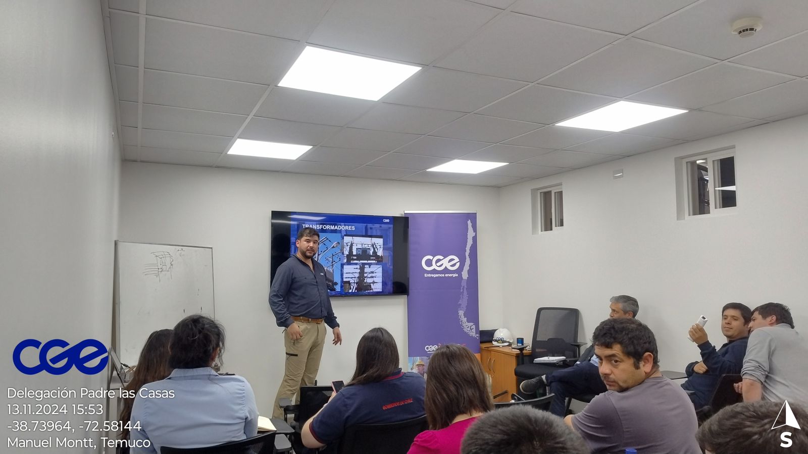 Padre Las Casas, 21 de noviembre 2024. En el marco de los planes de relacionamiento con instituciones y comunidades, representantes de CGE encabezados por Francisco Aspee jefe de la Delegación Padre Las Casas, realizaron una capacitación sobre riesgos eléctricos y protocolos de emergencia dirigida a funcionarios de la Municipalidad de la comuna.
