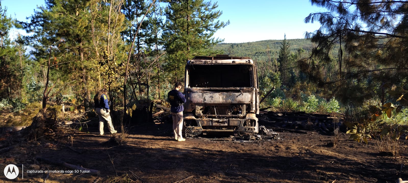 Extraoficialmente se reportan al menos cuatro camiones los incendiados en un predio forestal del fundo conocido como Las Toscas, ubicado en el sector Centenario, en la ruta hacia el sector Las Rosas, por Lumaco.