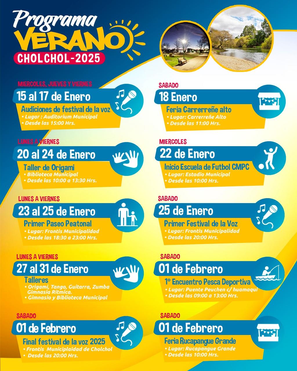 Con el objetivo de posicionar a la comuna de Cholchol como un referente cultural, el municipio, liderado por su alcalde, Álvaro Labraña, ofrece a la comunidad una nutrida cartelera de actividades para este verano 2025, la que incluye iniciativas deportivas, ferias de emprendimiento, talleres, show artísticos y gastronomía típica.