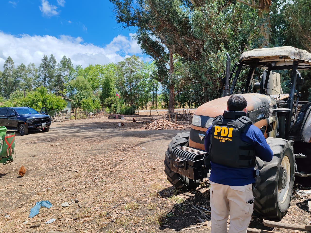 Detectives de la Brigada de Investigaciones Policiales Especiales y Antisecuestros Angol, BIPE, junto con el Laboratorio de Criminalística Cobertura Sur (LACRIM), concurrieron al Fundo Rinconada de la comuna de Los Sauces para desarrollar diligencias investigativas a fin de esclarecer la quema de un tractor agrícola, una maquina enfardadora y una cortadora de pasto, las cuales resultaron totalmente siniestradas producto del fuego.
