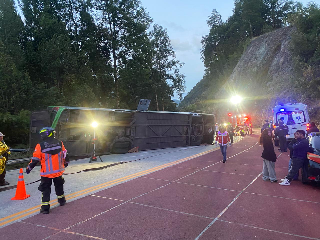 El bus, proveniente de la Octava Región, volcó a un costado de la carretera, lo que generó una movilización inmediata de equipos de emergencia.