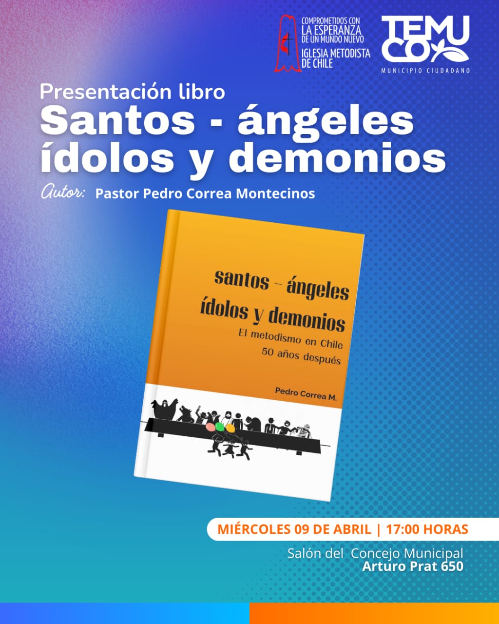El Miércoles 9 de Abril a las 17:00 horas se realizara el lanzamiento del libro “Santos- Ángeles Ídolos y Demonios” de Rev. Pedro Correa Montecinos en el Salón del Concejo de la Municipalidad de Temuco, ubicado en calle Arturo Prat 650, Temuco.