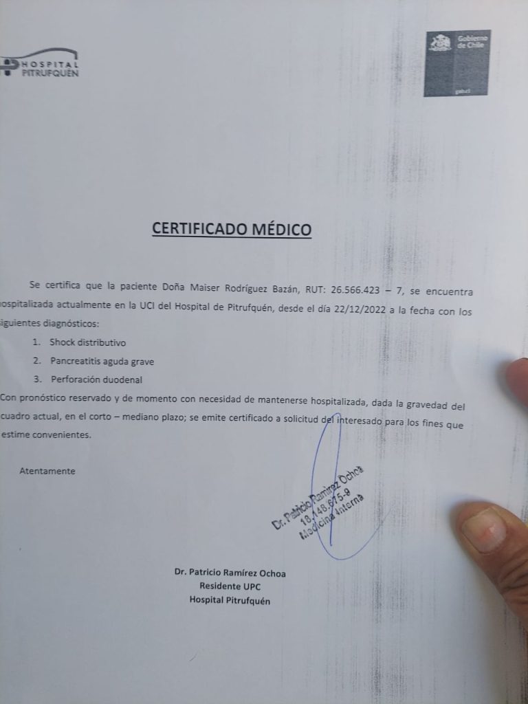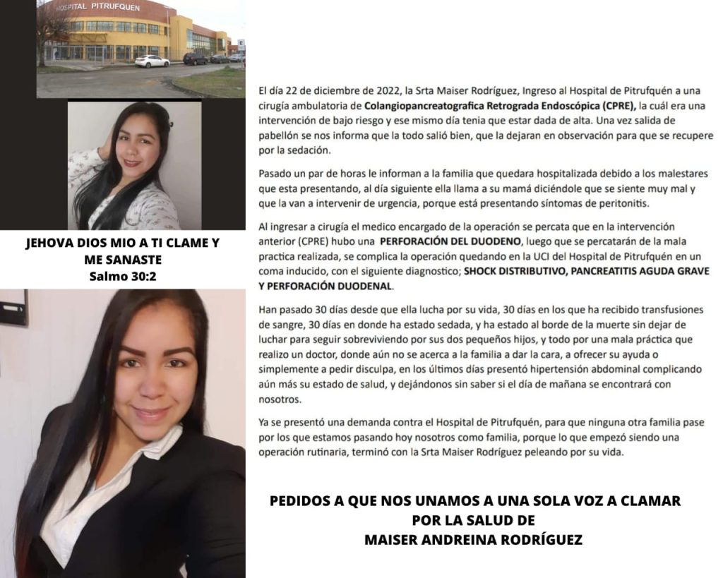 El día 22 de diciembre de 2022, la Srta Maiser Rodríguez, Ingreso al Hospital de Pitrufquén a una cirugía ambulatoria de Colangiopancreatografica Retrograda Endoscópica (CPRE), la cuál era una intervención de bajo riesgo y ese mismo día tenia que estar dada de alta. Una vez salida de pabellón se nos informa que la todo salió bien, que la dejaran en observación para que se recupere por la sedación.