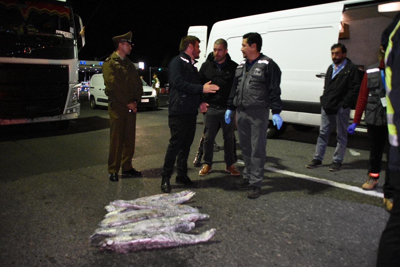 Al respecto el delegado presidencial, indicó que “se trata de un trabajo coordinado entre diversos servicios que están fiscalizando desde el viernes en esta barrera sanitaria. A la fecha ya ha habido más de 90 fiscalizaciones, y la incautación de cerca de dos toneladas y se va a seguir realizando esta labor intersectorial; donde SII fiscaliza que los vehículos de transporte tengan las guías y facturas correspondientes; por otro lado, Sernapesca revisa que se cumplan con las condiciones de trazabilidad; y seremi de salud revisa las condiciones sanitarias de traslado y de los productos”.