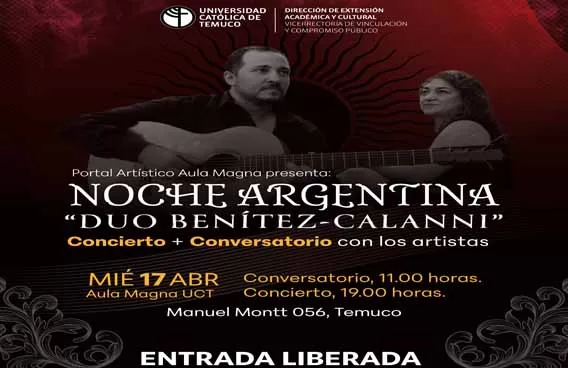 El concierto “Noche Argentina”, evento a cargo de la Dirección de Extensión Académica y Cultural de la UCT, es con entrada liberada hasta llenar los asientos. “Estamos muy contentos con la invitación de la universidad. Es un placer para nosotros, poder estar ahí con nuestro cancionero argentino y americano. Esperemos que haya mucha gente para compartirla por ahora”, sentenció.