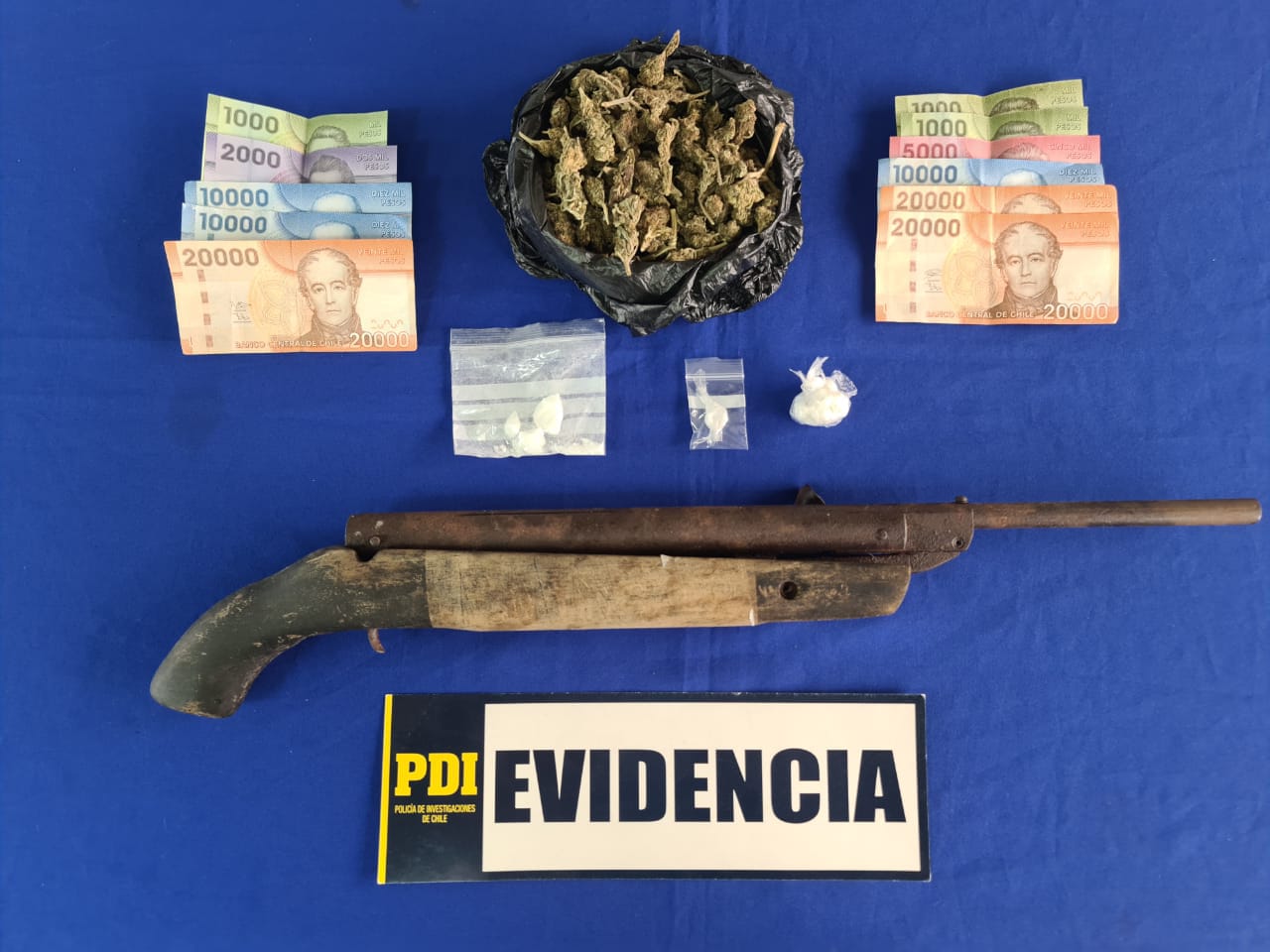 “Al registro de los inmuebles, uno de ellos ubicado en la villa Los Volcanes, del sector Segunda Faja, y otro en la población Diego Portales de esta comuna, se encontró evidencia vinculada a los delitos investigados (…) se incautaron 91, 6 gramos de cannabis 5,92 gramos de cocaína, 3,9 gramos de una droga sintética, dinero en efectivo, balanzas y diversos elementos de dosificación, además de una estructura de madera y un cuerpo metálico, correspondientes aparentemente a un arma tipo rifle”, agregó la jefa de la PDI Villarrica.