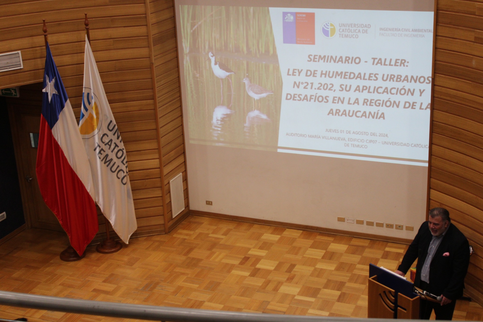 El seminario, realizado en el auditórium del Campus San Juan Pablo II de la UC Temuco, contó con las exposiciones de Sergio Sairafi, profesional de Ecosistemas Acuáticos del MMA, quien abordó la implementación de la Ley de Humedales Urbanos a nivel nacional, realizando una bajada a nivel regional la profesional Marta Hernández quien abordó la situación actual en La Araucanía. Más adelante los asistentes analizaron los aspectos generales metodológicos para la delimitación de humedales urbanos realizando un trabajo práctico a cargo de la profesional del nivel central, Paula Otth.