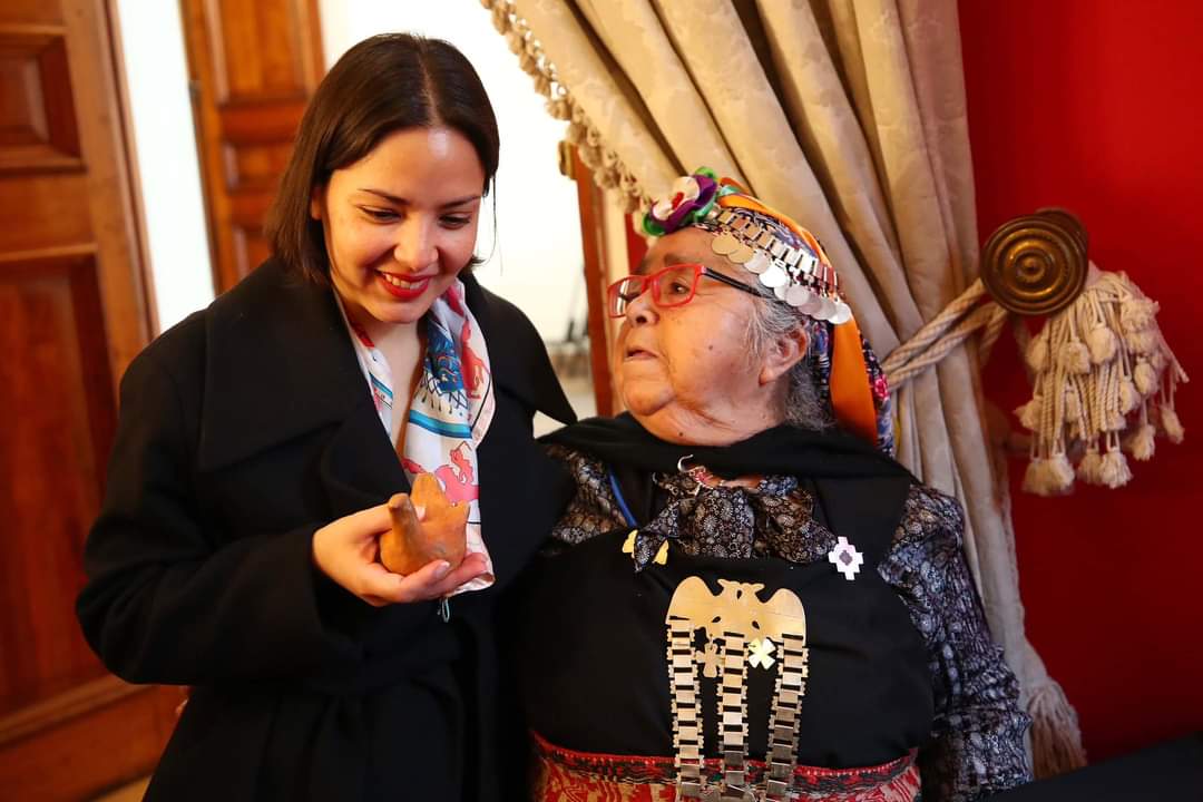 Carolina Arredondo Marzán, Ministra de las Culturas, las Artes y el Patrimonio hizo entrega del reconocimiento a la vez de recibir un metawe de manos de María Cachaña.