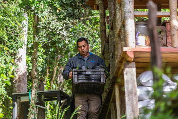 Héctor Huenchul Huilcapán, miembro de la comunidad Quintul 1 en Cholchol, es uno de los encargados de recibir y cultivar los ejemplares de relbún que son creados en el vivero de la empresa. Según Héctor, su recuperación es fundamental para que las comunidades valoren y utilicen esta planta en la artesanía. “Con esta especie en particular, los artesanos pueden teñir sus lanas de color rojo de manera natural, lo cual les permite comercializar sus productos con identidad cultural”, explica.