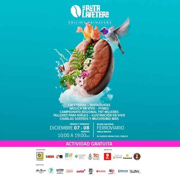 Mientras que la organización de la Ruta Cafetera hizo una invitación a la comunidad a ser parte de esta nueva edición, “invitamos a todas y todos a visitar el Museo Ferroviario de Temuco este 7 y 8 de diciembre, en el que se realizará La Ruta Cafetera edición de primavera, un lugar de encuentro para personas aficionadas y profesionales del café, además de empresas y organizaciones. Estaremos acompañados de una gran diversidad de talleres y rubros creativos; emprendimientos, ilustración, fotografía, productos gourmet, además de las más destacadas cafeterías de la región e incluso invitados desde Santiago, Valdivia y Punta Arenas. En esta oportunidad, además, se realizará el primer Campeonato de Baristas Mujeres, para tener a nuestra representante femenina regional en esta disciplina. Los invitamos a sumergirse en el mundo del café y a conocer cuál es su viaje desde los cafetales hasta tu mesa. Un tremendo evento que podemos realizar gracias al apoyo del Gobierno Regional quienes han estado presentes desde el inicio por medio de la Corporación de Desarrolla Araucanía, y a la Municipalidad de Temuco por medio de su Dirección de Turismo, Patrimonio y Cultura”.