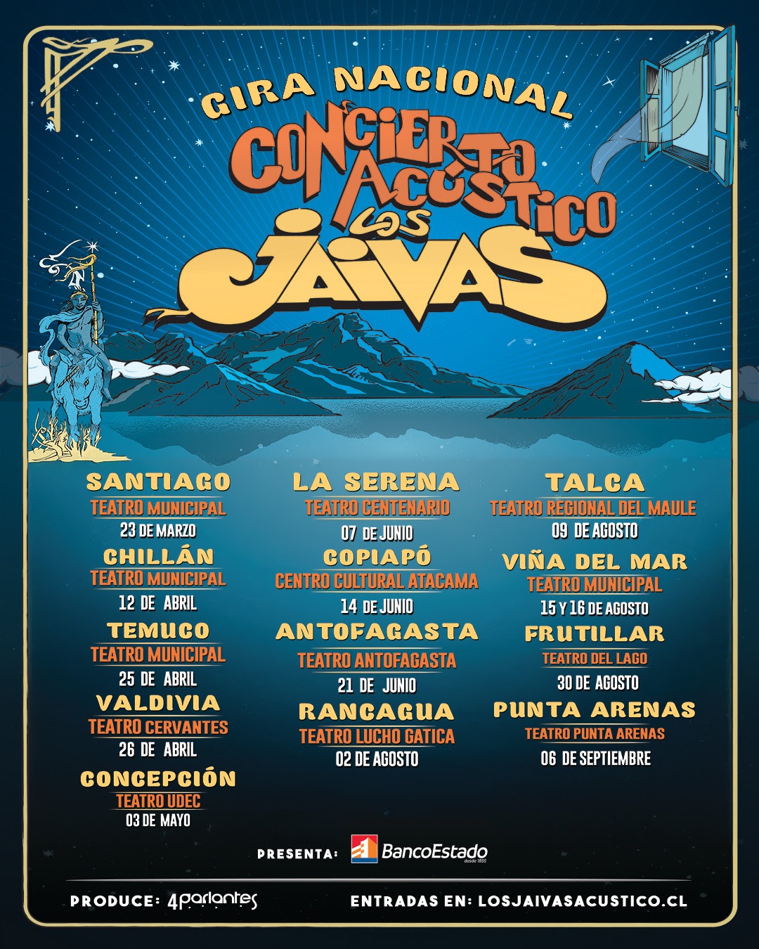 Preventa exclusiva para clientes BancoEstado con 20% de descuento, del 29 al 31 de enero. Venta general desde el 1 de febrero. Entradas disponibles en losjaivasacustico.cl