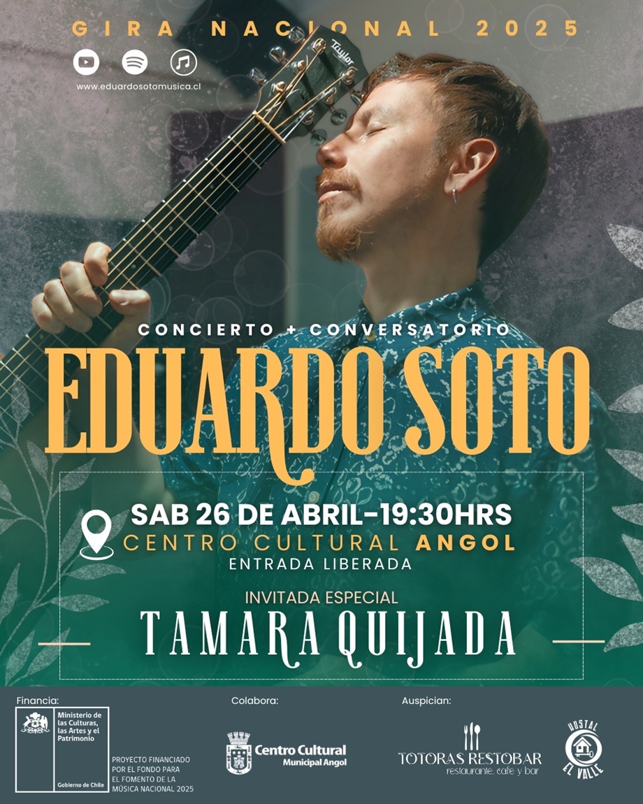 En el marco de su gira nacional, en la que interpreta canciones de su quinto disco El Sueño de Los Coihues y adelanta parte de su último álbum Canciones Pendientes, el cantautor Eduardo Soto ofrecerá un concierto gratuito el sábado 26 de abril a las 19:30 horas en el Centro Cultural de Angol.