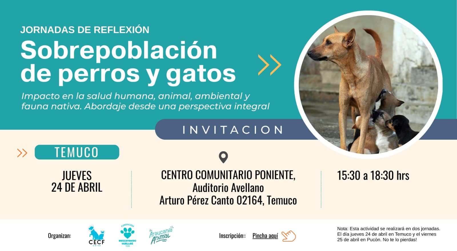 Con el objetivo de generar conciencia y promover soluciones efectivas frente a uno de los desafíos más relevantes en salud pública y animal de la región, los días 24 y 25 de abril se desarrollará el Seminario Regional “Jornadas de Reflexión sobre la sobrepoblación de perros y gatos a nivel regional y su impacto en la salud humana, animal, ambiental y fauna nativa”, en las comunas de Temuco y Pucón.