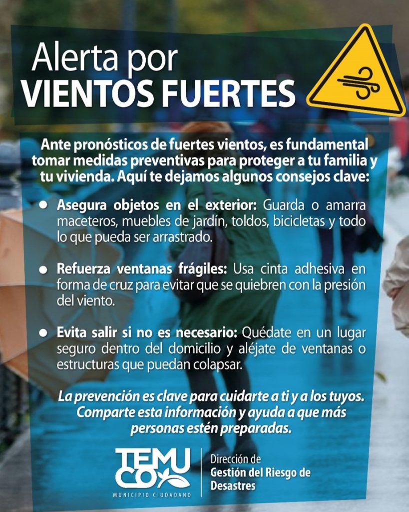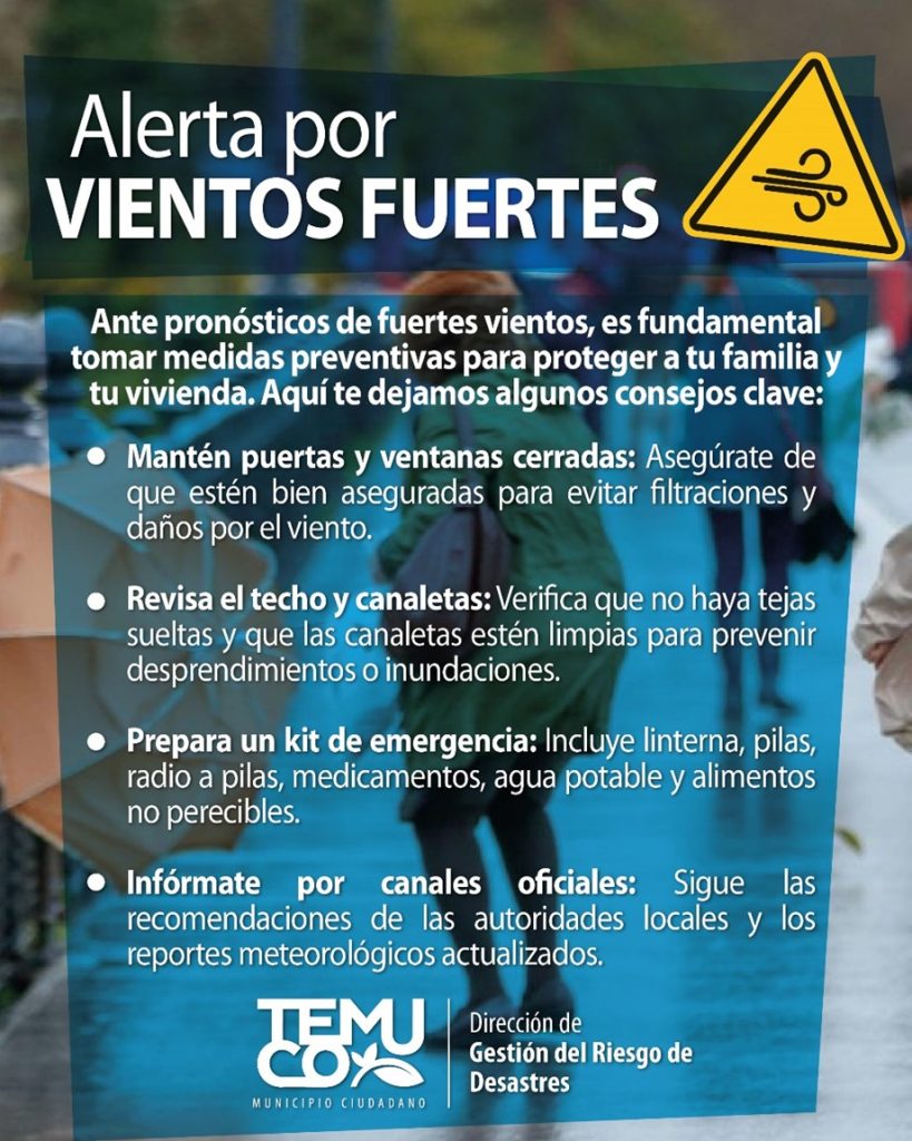 Ante la alerta preventiva por condiciones climáticas adversas que afectarán a nuestra ciudad desde la tarde de este viernes y durante la madrugada del sábado, la Municipalidad de Temuco ha activado un plan de acción preventivo y de mitigación a través de sus direcciones de Operaciones, DIMAO, Gestión del Riesgo de Desastres y Seguridad Pública.