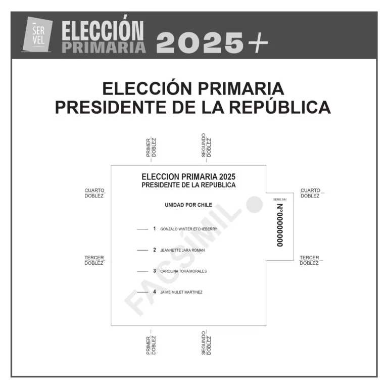 El Servicio Electoral (Servel) reveló el diseño oficial de la papeleta para la primaria presidencial del pacto Unidad por Chile, que se realizará el próximo domingo 29 de junio. Esta instancia es clave para definir al candidato único de la coalición para las elecciones presidenciales de noviembre.