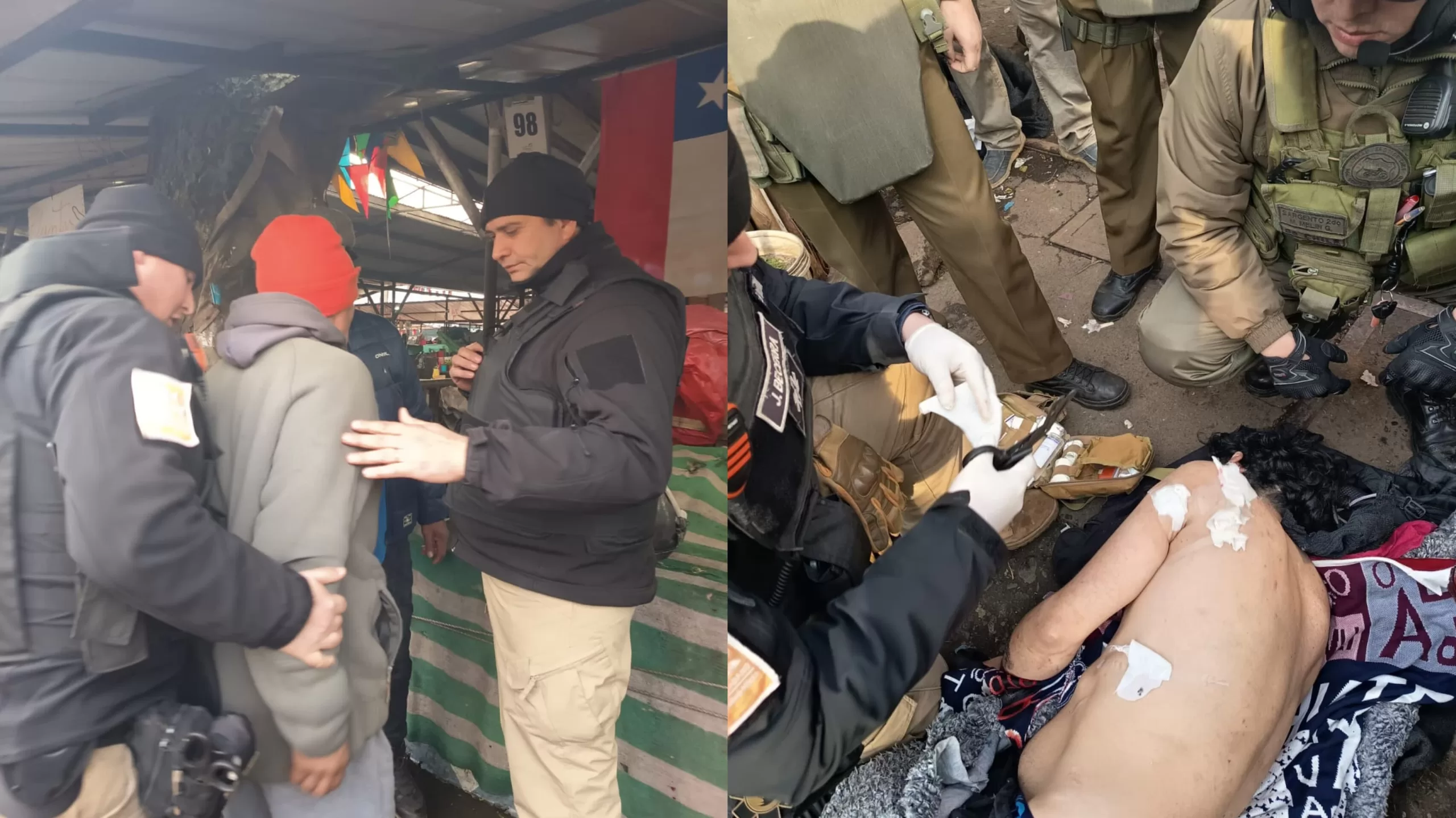 Funcionarios de la Dirección de Seguridad Pública de Temuco, que patrullaban el lugar en el marco del Plan Mejor Feria Pinto, intervinieron rápidamente. Lograron socorrer al herido, reducir a los agresores e impedir su fuga, según confirmaron testigos del hecho.