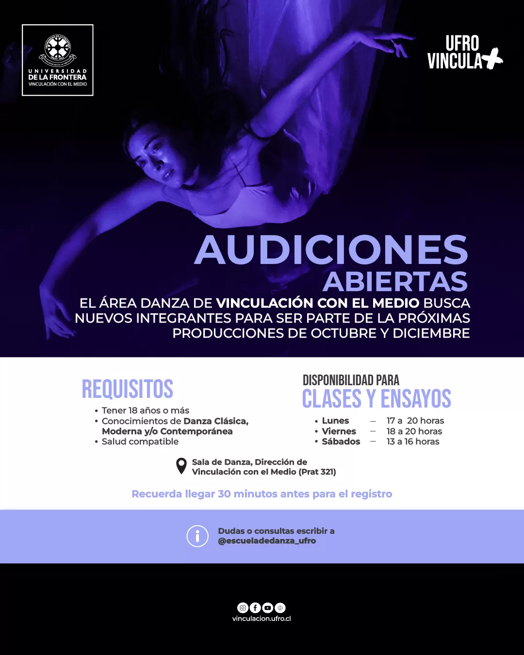 Para aclarar dudas o realizar consultas escribir a @escueladedanza_ufro