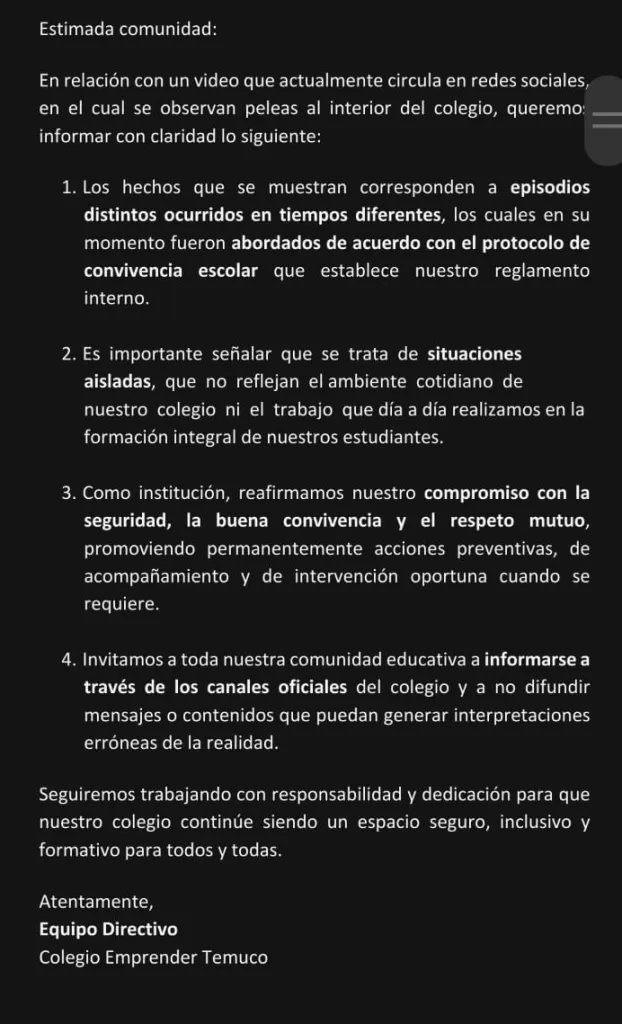 El Liceo Emprender de Temuco emitió un comunicado interno dirigido a sus apoderados, luego de que circulara un video en redes sociales mostrando peleas entre estudiantes al interior del establecimiento. En el texto, la dirección aseguró que los hechos fueron “abordados de acuerdo con el protocolo de convivencia escolar”, recalcando que se trató de episodios aislados y que se promueven “acciones preventivas y de acompañamiento”.