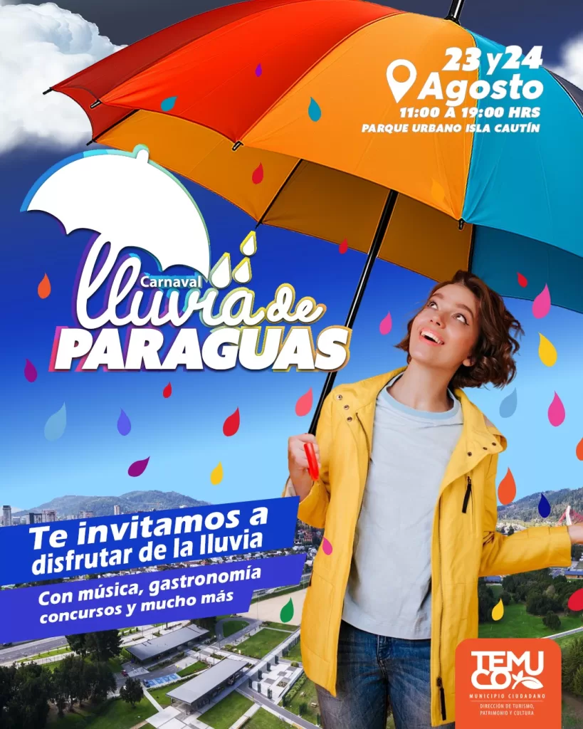 Temuco se prepara para vivir una de las celebraciones más esperadas del invierno: el Carnaval “Lluvia de Paraguas”, que se realizará los días 23 y 24 de agosto en el Parque Urbano Isla Cautín, entre las 11:00 y las 19:00 horas. Este evento gratuito, organizado por la Dirección de Turismo, Patrimonio y Cultura de la Municipalidad de Temuco, busca transformar la temporada de lluvia en una oportunidad de encuentro ciudadano, cultura y fomento del emprendimiento local.