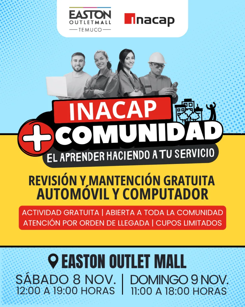 Con el propósito de acercar el conocimiento técnico y profesional a las personas, INACAP Sede Temuco, junto a Easton Outlet Mall, realizarán este fin de semana la jornada “INACAP + Comunidad: El aprender haciendo a tu servicio”, una instancia gratuita y abierta al público que ofrecerá atención básica para automóviles y equipos computacionales.
