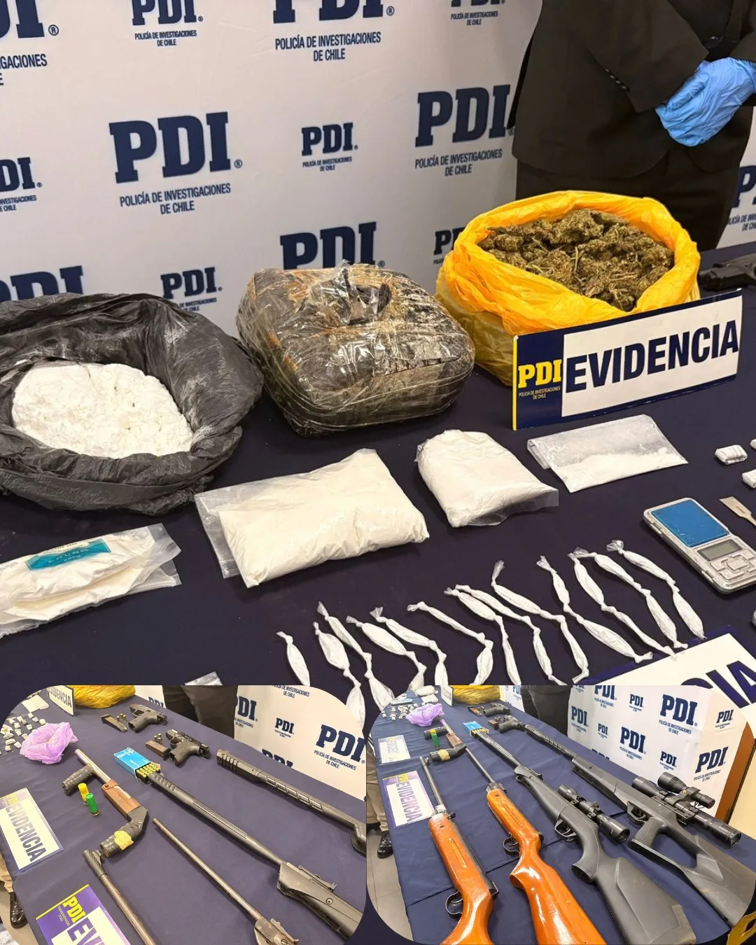El operativo incluyó el allanamiento de ocho inmuebles, seis en Temuco y dos en sectores rurales de la comuna de Chol Chol, logrando la incautación de más de cuatro kilos de droga, dinero en efectivo, armamento a fogueo y rifles con miras telescópicas.