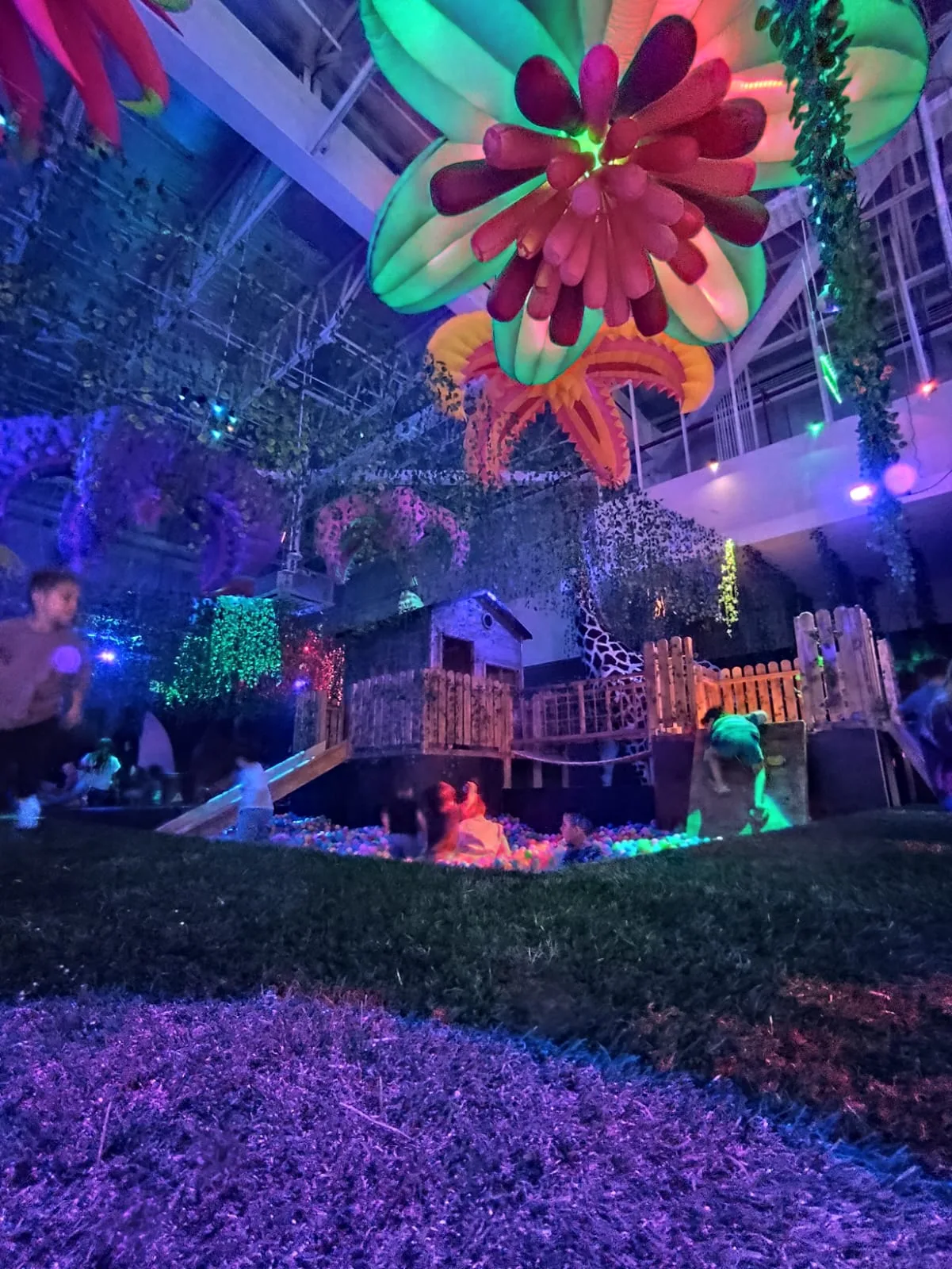 Uno de los principales atractivos de la experiencia es la cercanía con los animales, ya que varios de ellos permiten que los visitantes se suban para tomarse fotografías, generando una interacción directa que mezcla juego y asombro. A esto se suma una cuidada ambientación inspirada en la jungla, con una explosión de colores, sonidos y escenografías que convierten el recorrido en una experiencia envolvente.